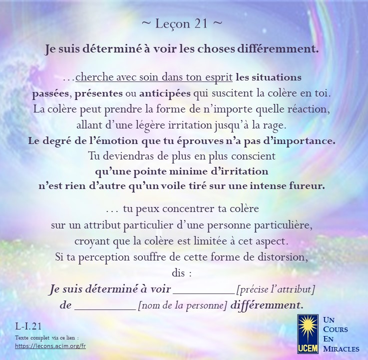 Leçon 21 Publié le 21 janvier 202519 janvier 2025 par Au delà du perçu ! https://lecons.acim.org/fr/chapters/lesson-21 Partager : Partager sur Facebook(ouvre dans une nouvelle fenêtre) Facebook Email a link to a friend(ouvre dans une nouvelle fenêtre) E-mail Imprimer(ouvre dans une nouvelle fenêtre) Imprimer J’aime chargement… Similaire