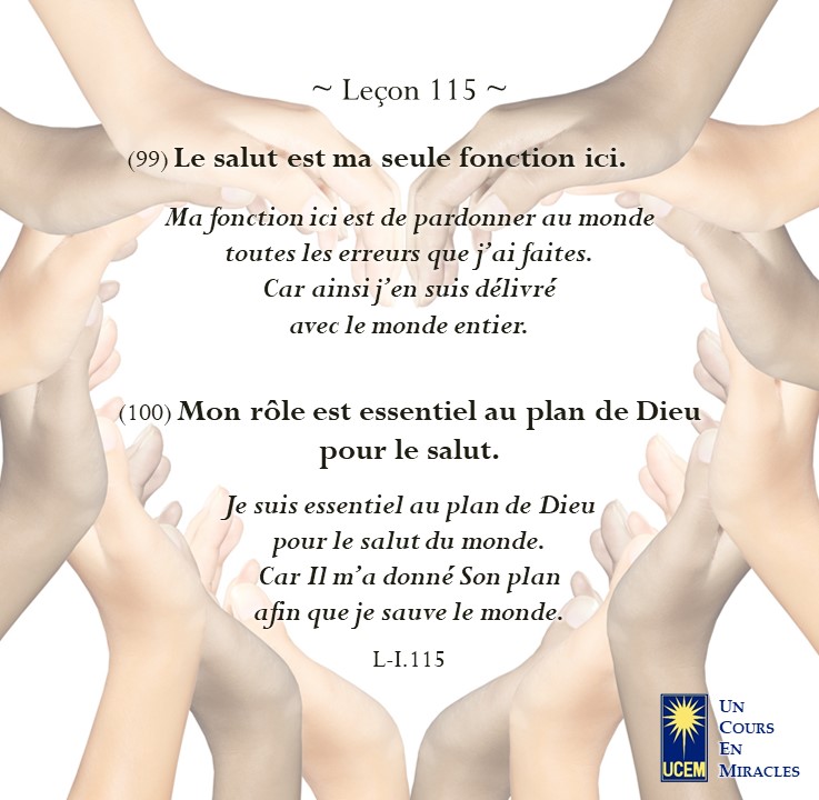 Leçon 115 – Révision III Publié le 25 avril 202521 avril 2025 par Au delà du perçu ! https://lecons.acim.org/fr/chapters/lesson-115 Partager : Partager sur Facebook(ouvre dans une nouvelle fenêtre) Facebook Email a link to a friend(ouvre dans une nouvelle fenêtre) E-mail Imprimer(ouvre dans une nouvelle fenêtre) Imprimer J’aime chargement… Similaire
