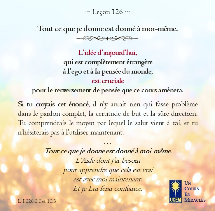 LEÇON 126 Publié le 6 Mai 20254 Mai 2025 par Au delà du perçu ! Tout ce que je donne est donné à moi-même. https://lecons.acim.org/fr/chapters/lesson-126 Partager : Partager sur Facebook(ouvre dans une nouvelle fenêtre) Facebook Email a link to a friend(ouvre dans une nouvelle fenêtre) E-mail Imprimer(ouvre dans une nouvelle fenêtre) Imprimer J’aime chargement… Similaire