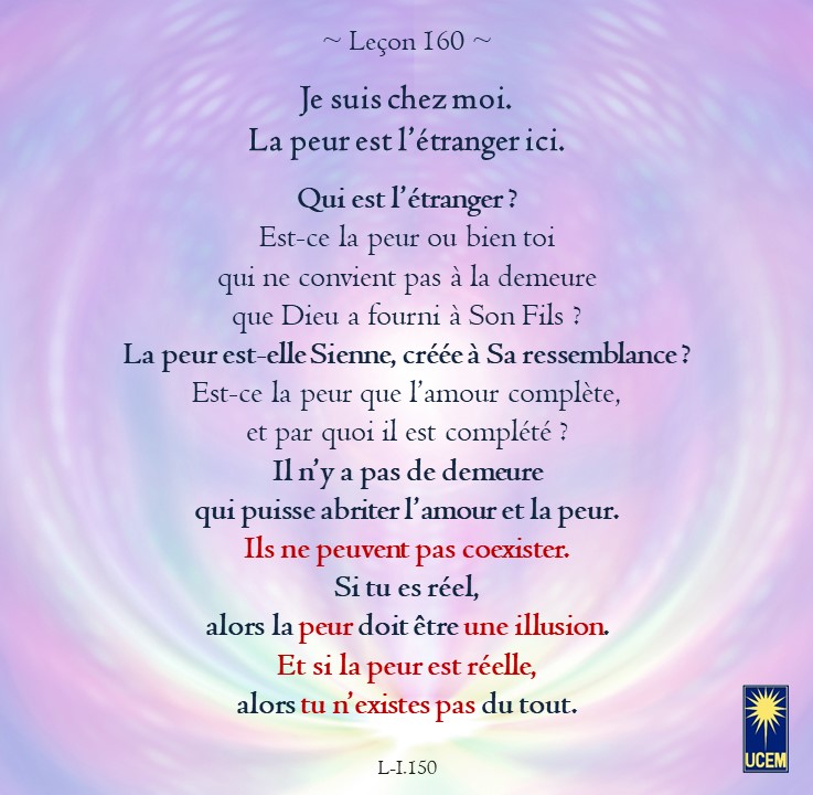 LEÇON 160 Publié le 8 juin 2025 par Au delà du perçu ! Je suis chez moi. La peur est l’étranger ici. https://lecons.acim.org/fr/chapters/lesson-160 Partager : Partager sur Facebook(ouvre dans une nouvelle fenêtre) Facebook Email a link to a friend(ouvre dans une nouvelle fenêtre) E-mail Imprimer(ouvre dans une nouvelle fenêtre) Imprimer J’aime chargement… Similaire