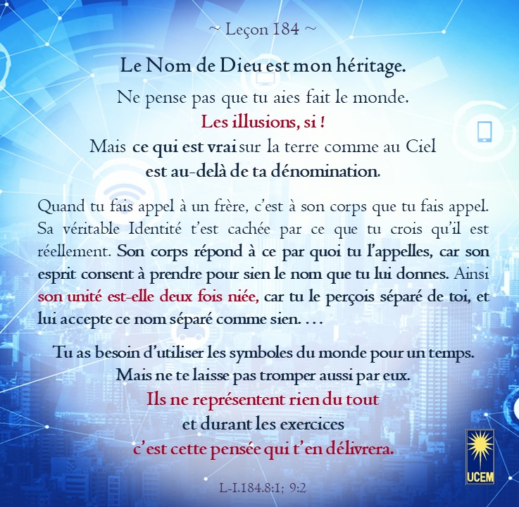 LEÇON 184 Publié le 2 juillet 2025 par Au delà du perçu ! Le Nom de Dieu est mon héritage. https://lecons.acim.org/fr/chapters/lesson-184 Partager : Partager sur Facebook(ouvre dans une nouvelle fenêtre) Facebook Email a link to a friend(ouvre dans une nouvelle fenêtre) E-mail Imprimer(ouvre dans une nouvelle fenêtre) Imprimer J’aime chargement… Similaire