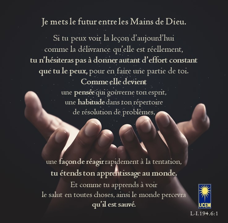 LEÇON 194 Publié le 12 juillet 202510 juillet 2025 par Au delà du perçu ! Je mets le futur entre les Mains de Dieu. https://lecons.acim.org/fr/chapters/lesson-194 Partager : Partager sur Facebook(ouvre dans une nouvelle fenêtre) Facebook Email a link to a friend(ouvre dans une nouvelle fenêtre) E-mail Imprimer(ouvre dans une nouvelle fenêtre) Imprimer J’aime chargement… Similaire