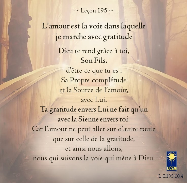 LEÇON 195 Publié le 13 juillet 202512 juillet 2025 par Au delà du perçu ! L’amour est la voie dans laquelle je marche avec gratitude. https://lecons.acim.org/fr/chapters/lesson-195 Partager : Partager sur Facebook(ouvre dans une nouvelle fenêtre) Facebook Email a link to a friend(ouvre dans une nouvelle fenêtre) E-mail Imprimer(ouvre dans une nouvelle fenêtre) Imprimer J’aime chargement… Similaire