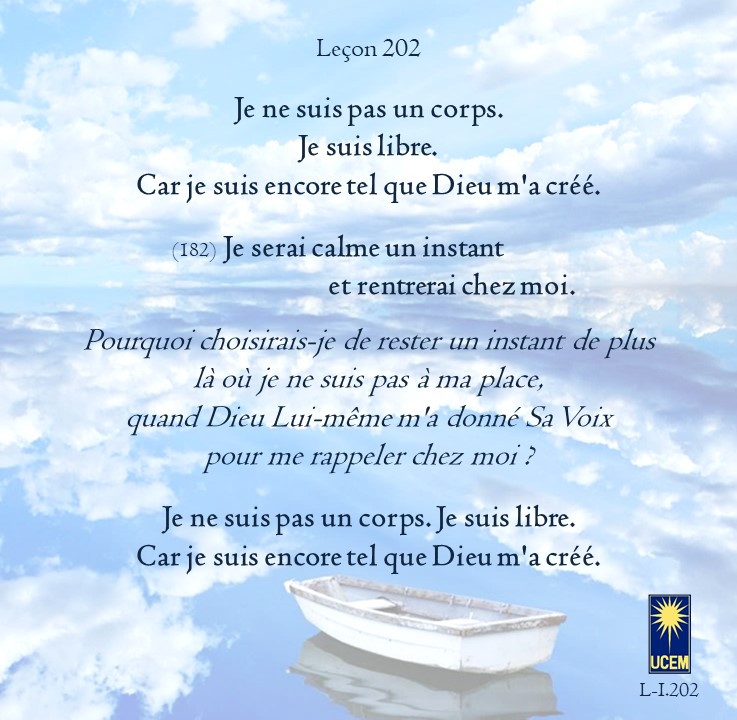 LEÇON 202 – Révision VI Publié le 20 juillet 2025 par Au delà du perçu ! Je ne suis pas un corps. Je suis libre.Car je suis encore tel que Dieu m’a créé. https://lecons.acim.org/fr/chapters/lesson-202 Partager : Partager sur Facebook(ouvre dans une nouvelle fenêtre) Facebook Email a link to a friend(ouvre dans une nouvelle fenêtre) E-mail Imprimer(ouvre dans une nouvelle fenêtre) Imprimer J’aime chargement… Similaire