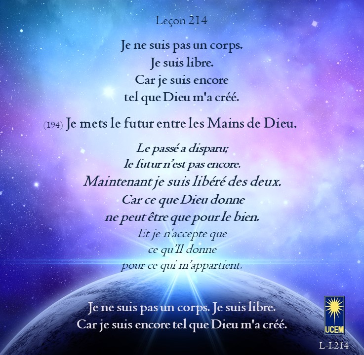 Leçon 214 – Révision VI Publié le 1 août 202527 juillet 2025 par Au delà du perçu ! Je ne suis pas un corps. Je suis libre.Car je suis encore tel que Dieu m’a créé. https://lecons.acim.org/fr/chapters/lesson-214 Partager : Partager sur Facebook(ouvre dans une nouvelle fenêtre) Facebook Email a link to a friend(ouvre dans une nouvelle fenêtre) E-mail Imprimer(ouvre dans une nouvelle fenêtre) Imprimer J’aime chargement… Similaire