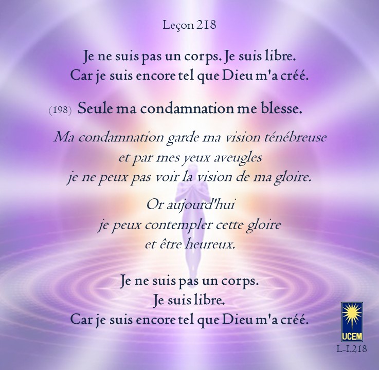 LEÇON 218 – Révision VI Publié le 5 août 20253 août 2025 par Au delà du perçu ! Je ne suis pas un corps. Je suis libre.Car je suis encore tel que Dieu m’a créé. https://lecons.acim.org/fr/chapters/lesson-218 Partager : Partager sur Facebook(ouvre dans une nouvelle fenêtre) Facebook Email a link to a friend(ouvre dans une nouvelle fenêtre) E-mail Imprimer(ouvre dans une nouvelle fenêtre) Imprimer J’aime chargement… Similaire