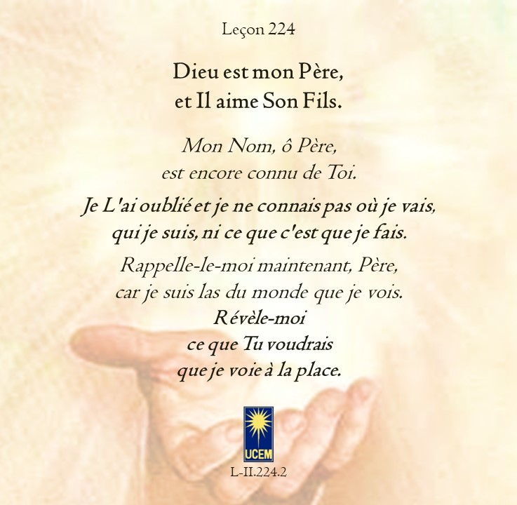 LEÇON 224 Publié le 11 août 2025 par Au delà du perçu ! Dieu est mon Père, et Il aime Son Fils. https://lecons.acim.org/fr/chapters/lesson-224 Partager : Partager sur Facebook(ouvre dans une nouvelle fenêtre) Facebook Email a link to a friend(ouvre dans une nouvelle fenêtre) E-mail Imprimer(ouvre dans une nouvelle fenêtre) Imprimer J’aime chargement… Similaire