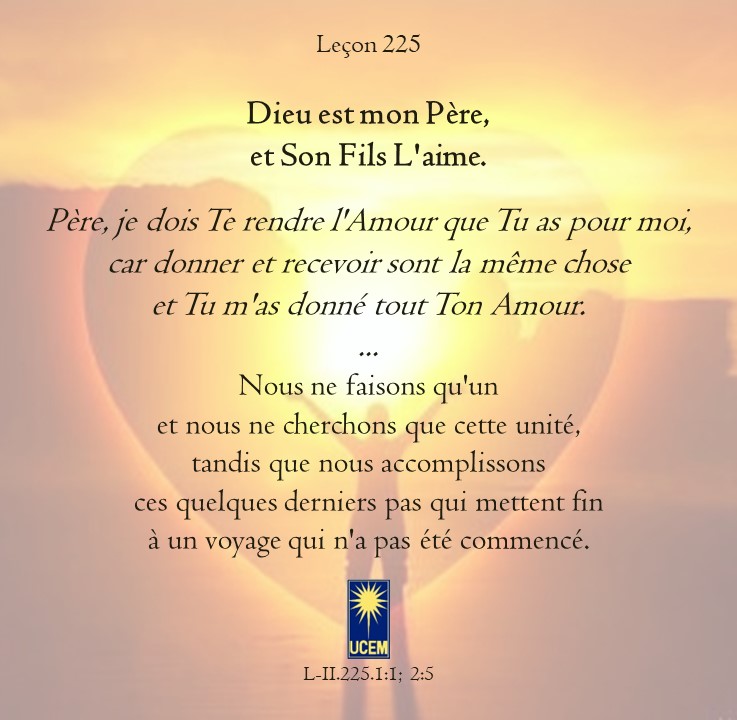 LEÇON 225 Publié le 12 août 202511 août 2025 par Au delà du perçu ! Dieu est mon Père, et Son Fils L’aime. https://lecons.acim.org/fr/chapters/lesson-225 Partager : Partager sur Facebook(ouvre dans une nouvelle fenêtre) Facebook Email a link to a friend(ouvre dans une nouvelle fenêtre) E-mail Imprimer(ouvre dans une nouvelle fenêtre) Imprimer J’aime chargement… Similaire