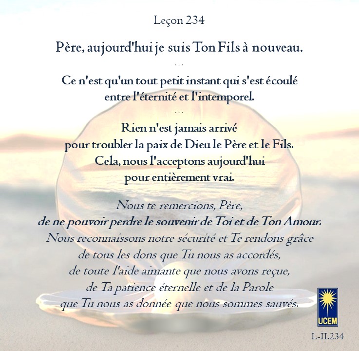 LEÇON 234 Publié le 21 août 202517 août 2025 par Au delà du perçu ! Père, aujourd’hui je suis Ton Fils à nouveau. https://lecons.acim.org/fr/chapters/lesson-234 Partager : Partager sur Facebook(ouvre dans une nouvelle fenêtre) Facebook Email a link to a friend(ouvre dans une nouvelle fenêtre) E-mail Imprimer(ouvre dans une nouvelle fenêtre) Imprimer J’aime chargement… Similaire