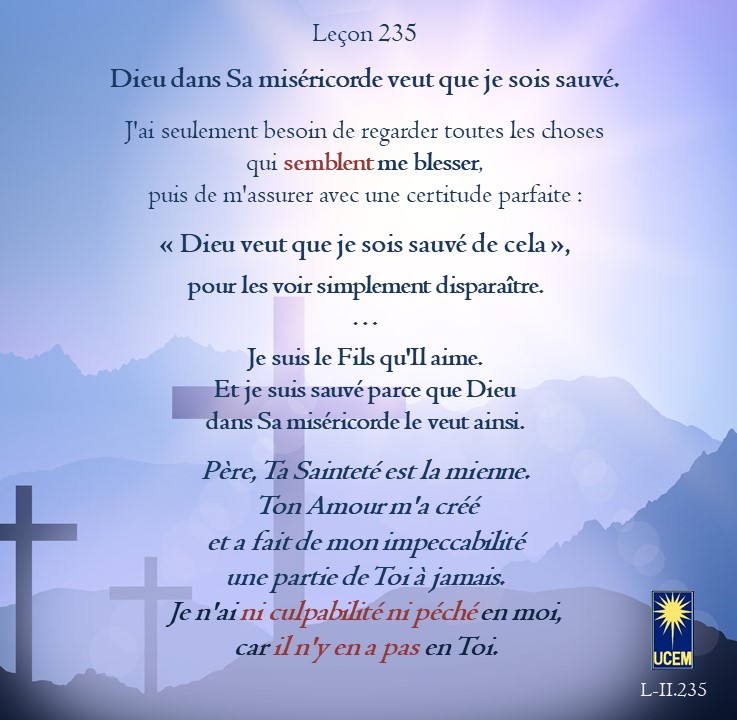 LEÇON 235 Publié le 22 août 202517 août 2025 par Au delà du perçu ! Dieu dans Sa miséricorde veut que je sois sauvé. https://lecons.acim.org/fr/chapters/lesson-235 Partager : Partager sur Facebook(ouvre dans une nouvelle fenêtre) Facebook Email a link to a friend(ouvre dans une nouvelle fenêtre) E-mail Imprimer(ouvre dans une nouvelle fenêtre) Imprimer J’aime chargement… Similaire