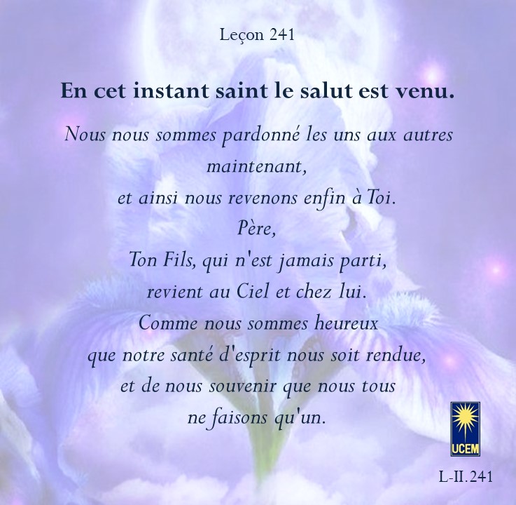 LEÇON 241 Publié le 28 août 202524 août 2025 par Au delà du perçu ! En cet instant saint le salut est venu. https://lecons.acim.org/fr/chapters/lesson-241 Partager : Partager sur Facebook(ouvre dans une nouvelle fenêtre) Facebook Email a link to a friend(ouvre dans une nouvelle fenêtre) E-mail Imprimer(ouvre dans une nouvelle fenêtre) Imprimer J’aime chargement… Similaire