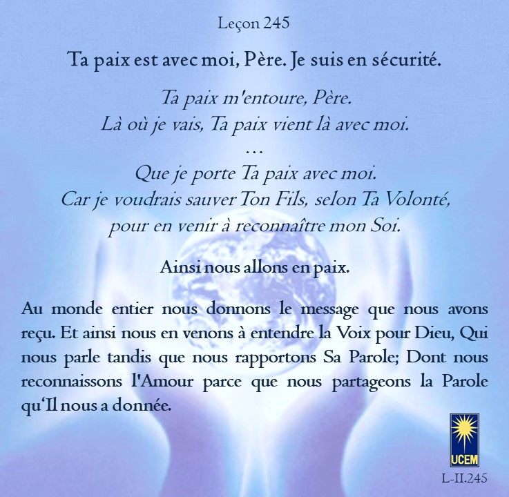 LEÇON 245 Publié le 1 septembre 2025 par Au delà du perçu ! Ta paix est avec moi, Père. Je suis en sécurité. https://lecons.acim.org/fr/chapters/lesson-245 Partager : Partager sur Facebook(ouvre dans une nouvelle fenêtre) Facebook Email a link to a friend(ouvre dans une nouvelle fenêtre) E-mail Imprimer(ouvre dans une nouvelle fenêtre) Imprimer J’aime chargement… Similaire