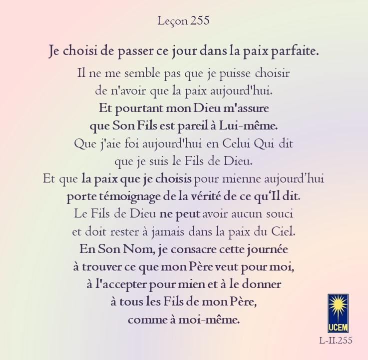 LEÇON 255 Publié le 11 septembre 20257 septembre 2025 par Au delà du perçu ! Je choisis de passer ce jour dans la paix parfaite. https://lecons.acim.org/fr/chapters/lesson-255 Partager : Partager sur Facebook(ouvre dans une nouvelle fenêtre) Facebook Email a link to a friend(ouvre dans une nouvelle fenêtre) E-mail Imprimer(ouvre dans une nouvelle fenêtre) Imprimer J’aime chargement… Similaire