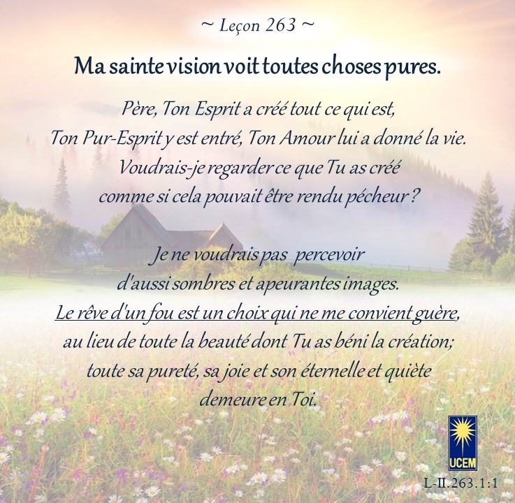 LEÇON 263 Publié le 19 septembre 202516 septembre 2025 par Au delà du perçu ! Ma sainte vision voit toutes choses pures. https://lecons.acim.org/fr/chapters/lesson-263 Partager : Partager sur Facebook(ouvre dans une nouvelle fenêtre) Facebook Email a link to a friend(ouvre dans une nouvelle fenêtre) E-mail Imprimer(ouvre dans une nouvelle fenêtre) Imprimer J’aime chargement… Similaire