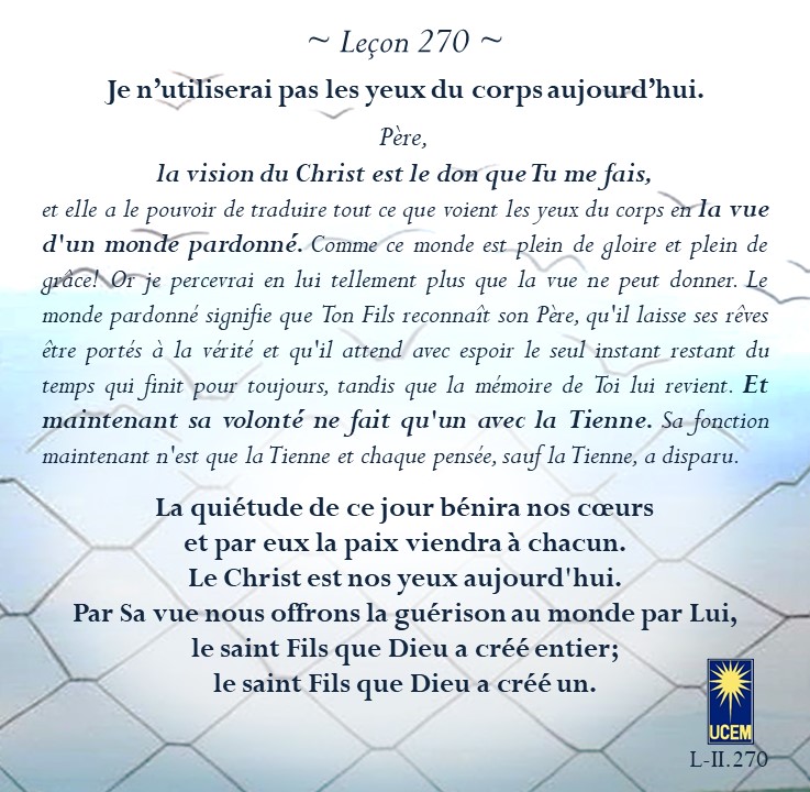 LEÇON 270 Publié le 26 septembre 202521 septembre 2025 par Au delà du perçu ! Je n’utiliserai pas les yeux du corps aujourd’hui. https://lecons.acim.org/fr/chapters/lesson-270 Partager : Partager sur Facebook(ouvre dans une nouvelle fenêtre) Facebook Email a link to a friend(ouvre dans une nouvelle fenêtre) E-mail Imprimer(ouvre dans une nouvelle fenêtre) Imprimer J’aime chargement… Similaire