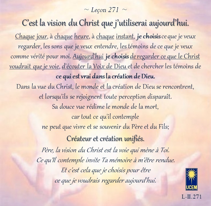 LEÇON 271 Publié le 27 septembre 202521 septembre 2025 par Au delà du perçu ! C’est la vision du Christ que j’utiliserai aujourd’hui. https://lecons.acim.org/fr/chapters/lesson-271 Partager : Partager sur Facebook(ouvre dans une nouvelle fenêtre) Facebook Email a link to a friend(ouvre dans une nouvelle fenêtre) E-mail Imprimer(ouvre dans une nouvelle fenêtre) Imprimer J’aime chargement… Similaire