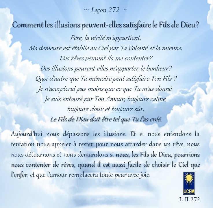LEÇON 272 Publié le 28 septembre 202521 septembre 2025 par Au delà du perçu ! Comment des illusions peuvent-elles satisfaire le Fils de Dieu? https://lecons.acim.org/fr/chapters/lesson-272 Partager : Partager sur Facebook(ouvre dans une nouvelle fenêtre) Facebook Email a link to a friend(ouvre dans une nouvelle fenêtre) E-mail Imprimer(ouvre dans une nouvelle fenêtre) Imprimer J’aime chargement… Similaire