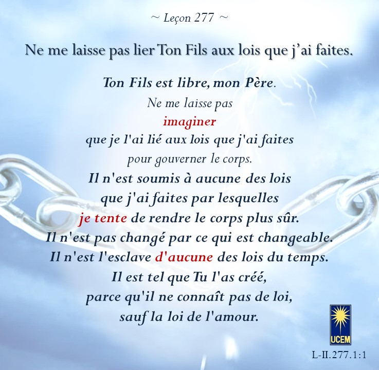 LEÇON 277 Publié le 3 octobre 202530 septembre 2025 par Au delà du perçu ! Ne me laisse pas lier Ton Fils aux lois que j’ai faites. https://lecons.acim.org/fr/chapters/lesson-277 Partager : Partager sur Facebook(ouvre dans une nouvelle fenêtre) Facebook Email a link to a friend(ouvre dans une nouvelle fenêtre) E-mail Imprimer(ouvre dans une nouvelle fenêtre) Imprimer J’aime chargement… Similaire