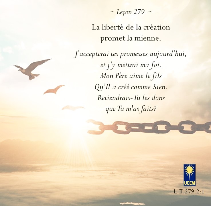 LEÇON 279 Publié le 5 octobre 2025 par Au delà du perçu ! La liberté de la création promet la mienne. https://lecons.acim.org/fr/chapters/lesson-279 Partager : Partager sur Facebook(ouvre dans une nouvelle fenêtre) Facebook Email a link to a friend(ouvre dans une nouvelle fenêtre) E-mail Imprimer(ouvre dans une nouvelle fenêtre) Imprimer J’aime chargement… Similaire