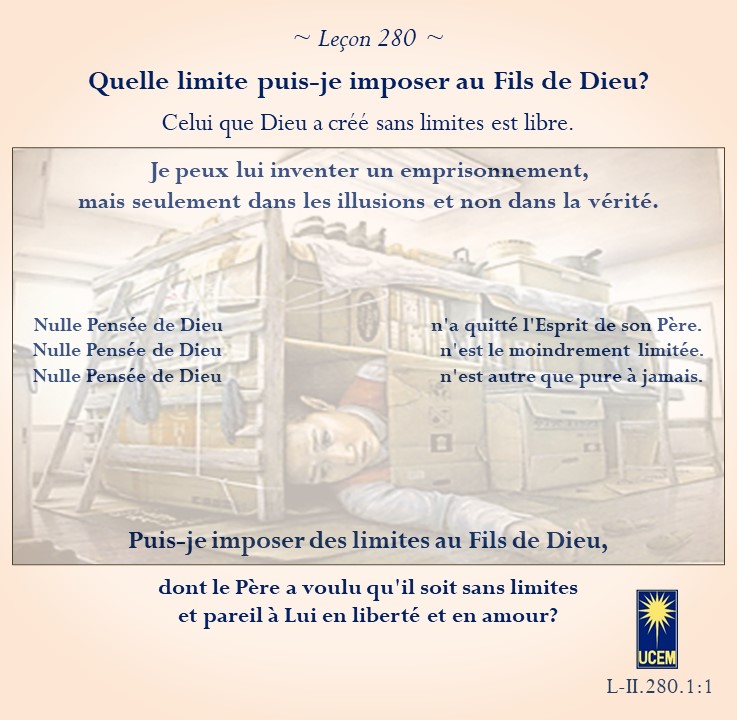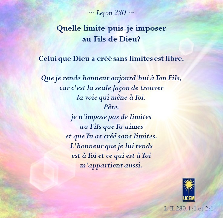LEÇON 280 Publié le 6 octobre 20255 octobre 2025 par Au delà du perçu ! Quelles limites puis-je imposer au Fils de Dieu? https://lecons.acim.org/fr/chapters/lesson-280 Partager : Partager sur Facebook(ouvre dans une nouvelle fenêtre) Facebook Email a link to a friend(ouvre dans une nouvelle fenêtre) E-mail Imprimer(ouvre dans une nouvelle fenêtre) Imprimer J’aime chargement… Similaire