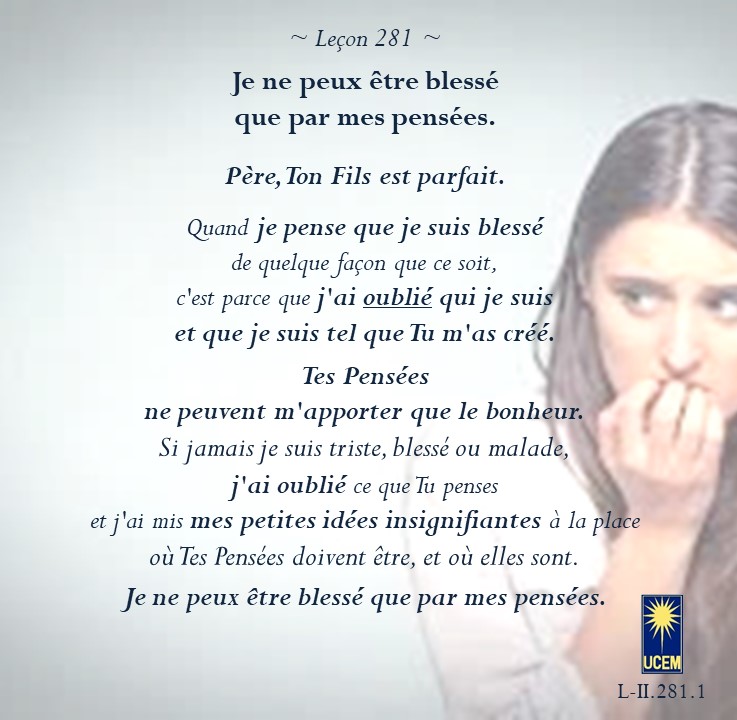 LEÇON 281 Publié le 7 octobre 20255 octobre 2025 par Au delà du perçu ! Je ne peux être blessé que par mes pensées. https://lecons.acim.org/fr/chapters/lesson-281 Partager : Partager sur Facebook(ouvre dans une nouvelle fenêtre) Facebook Email a link to a friend(ouvre dans une nouvelle fenêtre) E-mail Imprimer(ouvre dans une nouvelle fenêtre) Imprimer J’aime chargement… Similaire