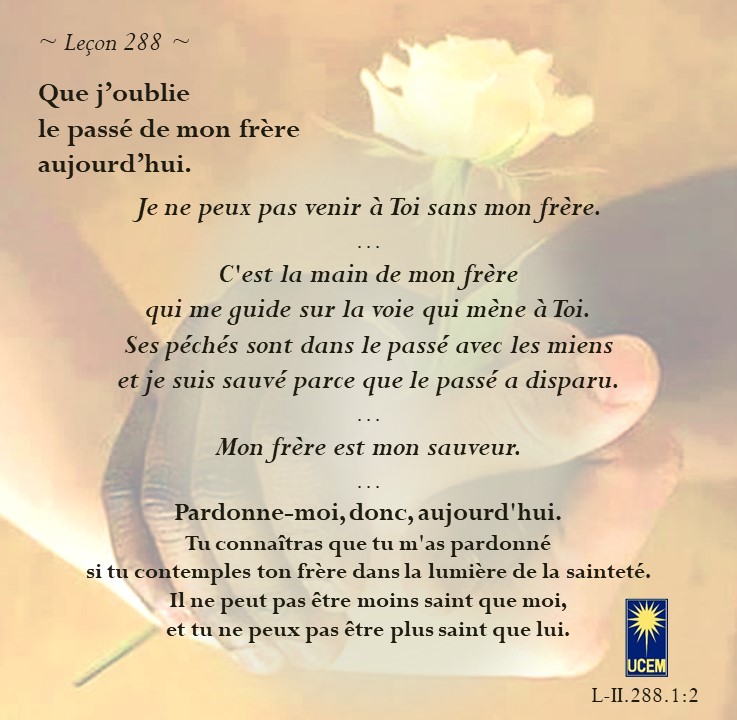 LEÇON 288 Publié le 14 octobre 202510 octobre 2025 par Au delà du perçu ! Que j’oublie le passé de mon frère aujourd’hui. https://lecons.acim.org/fr/chapters/lesson-288 Partager : Partager sur Facebook(ouvre dans une nouvelle fenêtre) Facebook Email a link to a friend(ouvre dans une nouvelle fenêtre) E-mail Imprimer(ouvre dans une nouvelle fenêtre) Imprimer J’aime chargement… Similaire