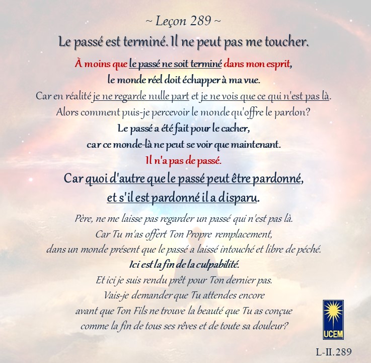 LEÇON 289 Publié le 15 octobre 202510 octobre 2025 par Au delà du perçu ! Le passé est terminé. Il ne peut pas me toucher. https://lecons.acim.org/fr/chapters/lesson-289 Partager : Partager sur Facebook(ouvre dans une nouvelle fenêtre) Facebook Email a link to a friend(ouvre dans une nouvelle fenêtre) E-mail Imprimer(ouvre dans une nouvelle fenêtre) Imprimer J’aime chargement… Similaire
