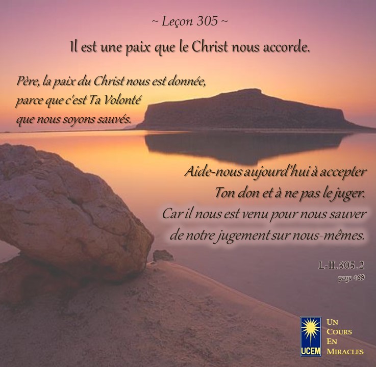 LEÇON 305 Publié le 31 octobre 202528 octobre 2025 par Au delà du perçu ! Il est une paix que le Christ nous accorde. https://lecons.acim.org/fr/chapters/lesson-305 Partager : Partager sur Facebook(ouvre dans une nouvelle fenêtre) Facebook Email a link to a friend(ouvre dans une nouvelle fenêtre) E-mail Imprimer(ouvre dans une nouvelle fenêtre) Imprimer J’aime chargement… Similaire