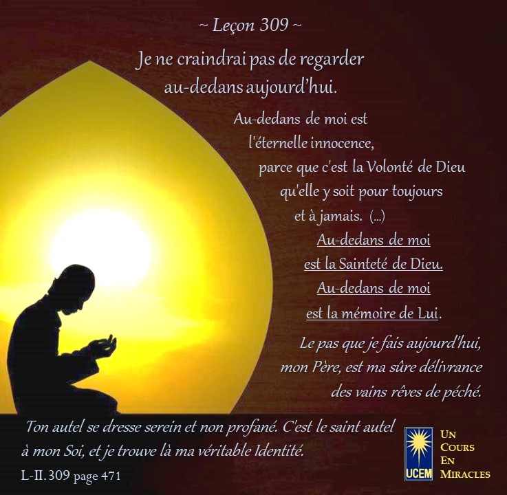 LEÇON 309 Publié le 4 novembre 20253 novembre 2025 par Au delà du perçu ! Je ne craindrai pas de regarder au-dedans aujourd’hui. https://lecons.acim.org/fr/chapters/lesson-309 Partager : Partager sur Facebook(ouvre dans une nouvelle fenêtre) Facebook Email a link to a friend(ouvre dans une nouvelle fenêtre) E-mail Imprimer(ouvre dans une nouvelle fenêtre) Imprimer J’aime chargement… Similaire