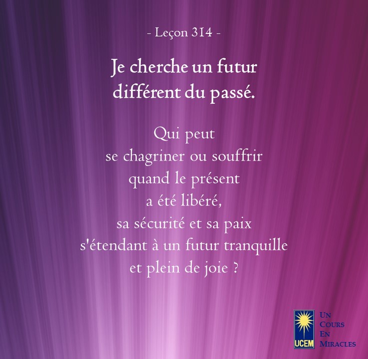 LEÇON 314 Publié le 9 novembre 20253 novembre 2025 par Au delà du perçu ! Je cherche un futur différent du passé. https://lecons.acim.org/fr/chapters/lesson-314 Partager : Partager sur Facebook(ouvre dans une nouvelle fenêtre) Facebook Email a link to a friend(ouvre dans une nouvelle fenêtre) E-mail Imprimer(ouvre dans une nouvelle fenêtre) Imprimer J’aime chargement… Similaire