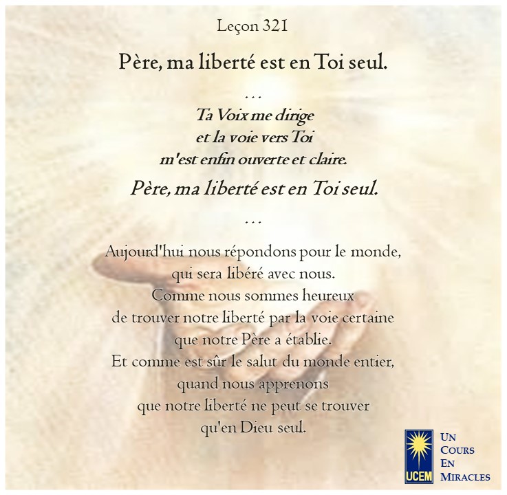 LEÇON 321 Publié le 16 novembre 20253 novembre 2025 par Au delà du perçu ! Père, ma liberté est en Toi seul. https://lecons.acim.org/fr/chapters/lesson-321 Partager : Partager sur Facebook(ouvre dans une nouvelle fenêtre) Facebook Email a link to a friend(ouvre dans une nouvelle fenêtre) E-mail Imprimer(ouvre dans une nouvelle fenêtre) Imprimer J’aime chargement… Similaire