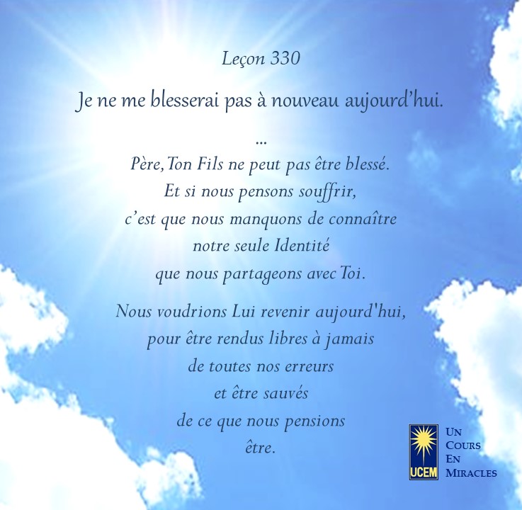 LEÇON 330 Publié le 25 novembre 202523 novembre 2025 par Au delà du perçu ! Je ne me blesserai pas à nouveau aujourd’hui. https://lecons.acim.org/fr/chapters/lesson-330 Partager : Partager sur Facebook(ouvre dans une nouvelle fenêtre) Facebook Email a link to a friend(ouvre dans une nouvelle fenêtre) E-mail Imprimer(ouvre dans une nouvelle fenêtre) Imprimer J’aime chargement… Similaire