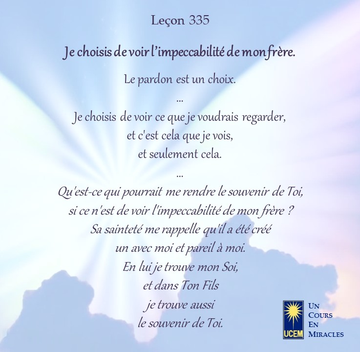 LEÇON 335 Publié le 30 novembre 2025 par Au delà du perçu ! Je choisis de voir l’impeccabilité de mon frère. https://lecons.acim.org/fr/chapters/lesson-335 Partager : Partager sur Facebook(ouvre dans une nouvelle fenêtre) Facebook Email a link to a friend(ouvre dans une nouvelle fenêtre) E-mail Imprimer(ouvre dans une nouvelle fenêtre) Imprimer J’aime chargement… Similaire