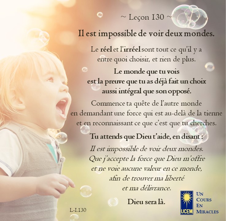 LEÇON 130 Publié le 10 Mai 20254 Mai 2025 par Au delà du perçu !Laisser un commentaire Il est impossible de voir deux mondes. https://lecons.acim.org/fr/chapters/lesson-130