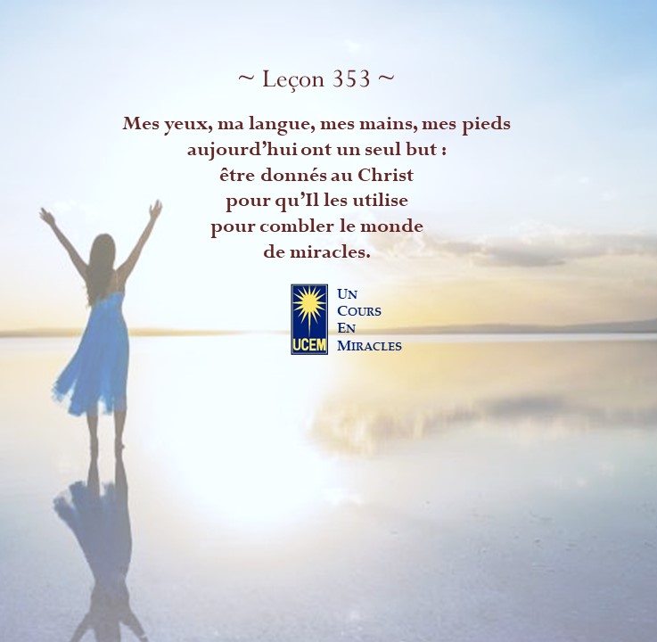 1. Père, je m’éveille aujourd’hui avec des miracles corrigeant ma perception de toutes choses. Ainsi commence la journée que je partage avec Toi comme je partagerai l’éternité, car le temps s’est écarté aujourd’hui. Je ne cherche pas les choses du temps et je ne les regarderai donc pas. Ce que je cherche aujourd’hui transcende toutes les lois du temps et les choses perçues dans le temps. Je voudrais oublier toutes choses, sauf Ton Amour. Je voudrais demeurer en Toi et ne connaître de lois que Ta loi de l’amour. Et je voudrais trouver la paix que Tu as créée pour Ton Fils, et oublier tous les sots jouets que j’ai faits, en contemplant Ta gloire et la mienne.