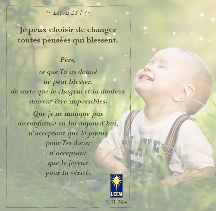 LEÇON 284 Publié le 10 octobre 2025 par Au delà du perçu !Laisser un commentaire Je peux choisir de changer toutes pensées qui blessent. https://lecons.acim.org/fr/chapters/lesson-284