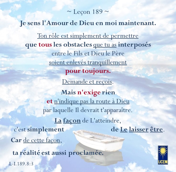 LEÇON 188 Publié le 6 juillet 2025 par Au delà du perçu !Laisser un commentaire La paix de Dieu luit en moi maintenant. https://lecons.acim.org/fr/chapters/lesson-188